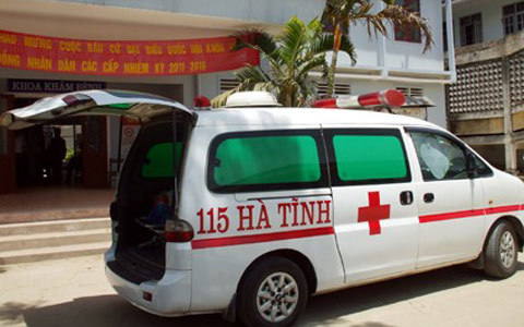 Xe chở thi thể sản phụ Nguyễn Thị Thuận trước Bệnh viện ĐK Cẩm Xuyên sau khi sản phụ chết. Ảnh: Báo Hà Tĩnh