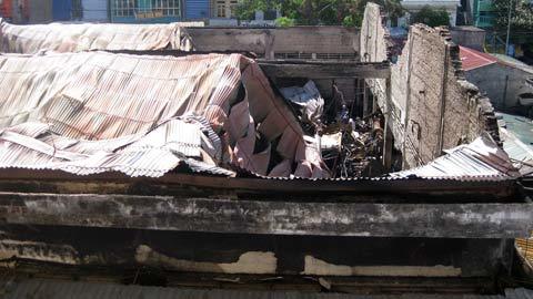 | Hiện trường đám cháy sáng 22/6, nhiều tiểu thương đang vật lộn giữa đống hoang tàn, đổ nát. |