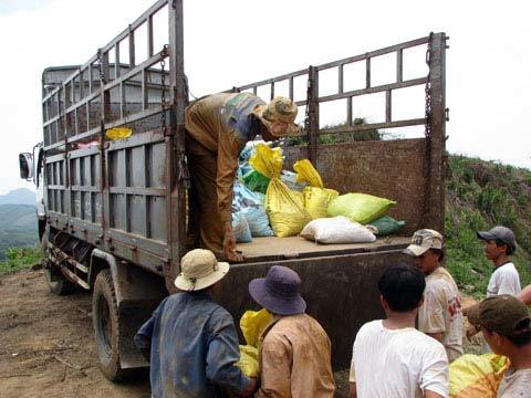 | Bị Trưởng CA xã nhắc nhở, chủ vàng bốc nhanh hàng trăm bao đất lên ô tô di chuyển khỏi hiện trường. Ảnh: Trường Hà. |