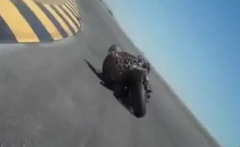 Trên đường đua mô-tô tại một khúc cua, tay lái này không những ngả rạp người xuống mà còn để đầu chạm mặt đường.