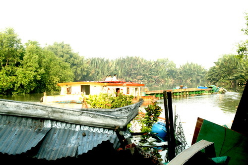 | Trong khi nhiều căn nhà bị sạt, sà lan vẫn tiếp tục lưu thong đang có nguy cơ sập tiếp những căn nhà con lại. |