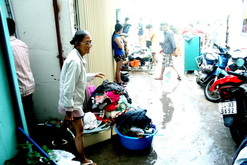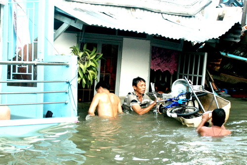 Đến sáng ngày 2/7, mặc dù con nước đang lớn, nhiều người đã lội vào bên trong căn nhà của mình để tìm những tài sản may mắn còn sót lại. Cả con hẻm chật hẹp giờ đây trở thành nơi trú ngụ và chứa tài sản của những gia đình gặp nạn.
