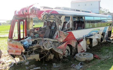 | Chiếc xe khách đấu đầu xe tải sáng ngày 7/7 khi đi qua địa phận xã Kỳ Giang, Kỳ Anh khiến 2 người chết, 5 người khác bị thương. (Ảnh: VNN) |