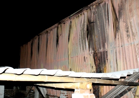 | Những tấm tôn vách của xưởng sản xuất bị biến dạng do bị lửa thiêu. |