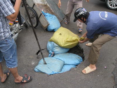 Khi PV có mặt tại hiện trường, thì cũng là lúc Ban quản lý giao thông đô thị Hà Nội đang cho người dùng xà beng đào rộng vết sụt lún rồi cho nhồi bao tải xuống.