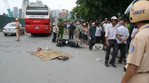 - Đang lưu thông trên đường, bất ngờ xe máy bị va quệt, người phụ nữ điều khiển xe máy ngã ra đường. Cùng lúc đó xe khách lao đến, bánh xe chèn ngang đầu, nạn nhân tử vong tại chỗ.