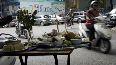 Những mâm cỗ cũng rằm được bầy ra vỉa hè sát đường, sau khóa lễ là đến màn hóa vàng.