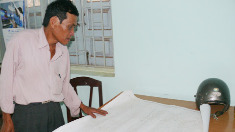 | Ông Nguyễn Văn Trung, Chủ nhiệm HTX Hiệp Phát trước tấm bàn đồ thu hồi đất làm dự án sân golf. Nỗi lo xã viên mất đất vẫn còn lơ lửng, dù dự án sân golf “treo” đã nhiều năm - Ảnh: Thái Thiện |