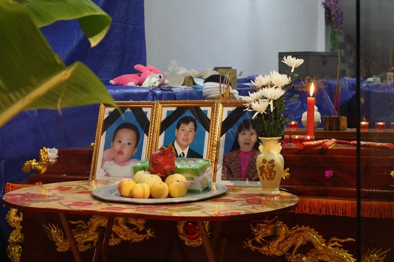 3 chiếc quan tài đặt cạnh nhau, phía trước được cắm những bông hoa, có cả hoa trắng. Cũng đúng, bởi họ còn quá trẻ, người bố mới ngoài 30, còn cháu Thảo, mới hơn 18 tháng tuổi.
