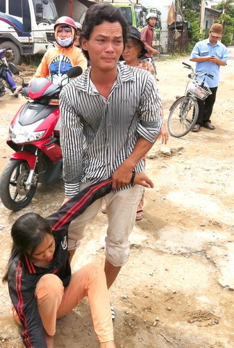 | Anh Hoài phải dìu chị Mùi lên xe đi bệnh viện |