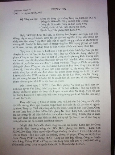| Điện khen của Bộ Công an đối với các lực lượng phá án. |