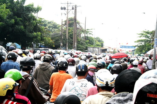 Cảnh ùn tắc nghiêm trọng trên đường dẫn vào bến phà Cát Lái |