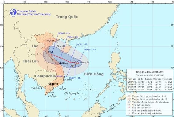 Hồi 10 giờ ngày 25/9 vị trí tâm bão ở vào khoảng 16,4 độ Vĩ Bắc; 112,8 độ Kinh Đông, trên khu vực quần đảo Hoàng Sa, cách bờ biển Quảng Trị - Quảng Ngãi khoảng 440 km về phía Đông. Sức gió mạnh nhất ở vùng gần tâm bão mạnh cấp 8 (tức là từ 62 đến 74 km một giờ), giật cấp 9, cấp 10.