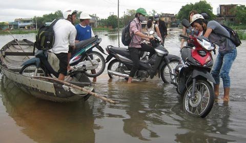 | Mỗi chiếc xe máy muốn qua đoạn ngập lụt tại xã Quảng Thành, huyện Quảng Điền phải “luỵ đò” chi trả từ 20 đến 30 ngàn đồng. |