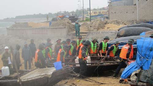 | Lực lượng trung đoàn C52, đóng tại Bạch Long Vĩ phối hợp với các cơ quan chức năng tiến hành di dời toàn bộ tàu thuyền của người dân lên bờ an toàn, giảm tối đa thiệt hại do cơn bão số 5 gây ra |