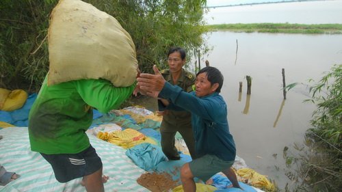 | Hàng trăm bao cát được bộ đội và người dân địa phương vận chuyển đến nơi vỡ đê (Ảnh: Tuổi Trẻ) |