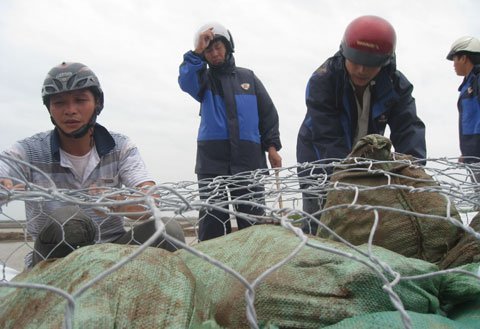 Hàng nghìn bao tải đất và những rọ thép được tập trung dải dọc những đoạn đê xung yếu.