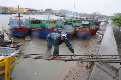 Dọc theo con đê những người dân mặc áo bạt đang hối hả gia cố đê, ứng phó với bão.