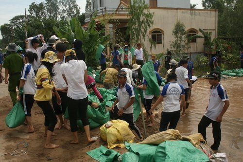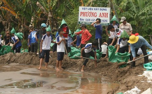 Khoảng 700 giáo viên các cấp học từ mầm non đến trung học phổ thông của huyện Hồng Ngự (Đồng Tháp) đã được huy động có mặt tại khu vực xã Thường Thới Tiền để tham gia bảo vệ bờ bao chống lũ.