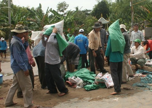 Mùa nước nổi năm nay, đê chưa bị sự cố nhưng do nước lũ lên cao có khả năng tràn qua nên phải gia cố nâng cao mặt đê.
