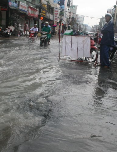nước đánh bật lên và nước từ dưới phun lên ào ạt, mặt đường lún nhiều nơi có khả