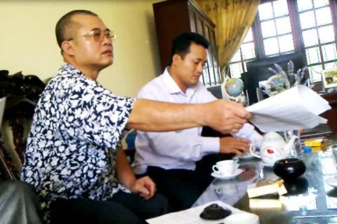 | Người đàn ông đeo kính ngồi cạnh Phó chủ tịch UBND thị trấn Phú Minh và đe dọa các phóng viên viết bài |