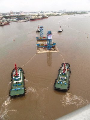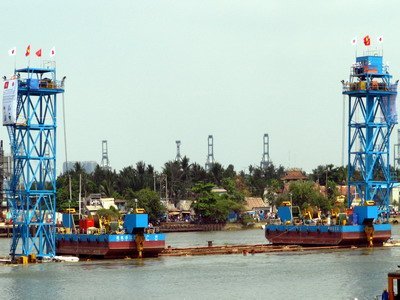 | ....sau đó được kéo ra khỏi bể đúc, neo đậu trên sông Lòng Tàu - Nhà Bè chuẩn bị quá trình lai dắt về vị trí ở Thủ Thiêm |