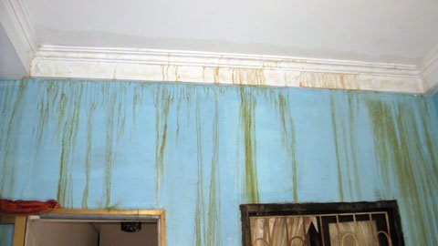 thấm trần, loang lổ hết do nước từ vòi rồng làm căn nhà sũng nước đã ngấm