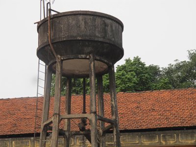 Cả tháp nước hình trụ được đỡ trên sáu cột bê-tông mỏng mảnh. Tất cả đều đã phủ kín rêu xanh. Tuy chưa có biểu hiện đe dọa đến sự an toàn, nhưng có vẻ như tháp nước này đã không còn được sử dụng.