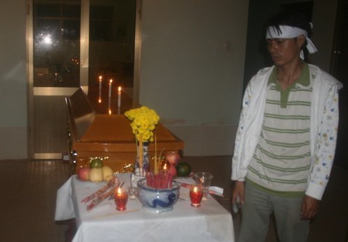 Tại nhà xác bệnh viện tỉnh Bình Thuận, anh Nguyễn Xuân Toàn nhận thi thể cha va khâm liệm trước khi đưa về quê. |