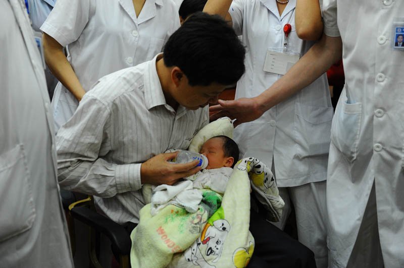 Cháu bé trong vòng tay của bố và các bác sỹ - Ảnh: Hoàng Long