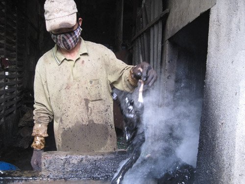 Tại đây, hàng ngàn con vịt đã vặt lông được các công nhân nhúng vào một nồi nước đen ngòm bốc khói (mà theo các công nhân thì đó là dầu thông), sau khi nhúng vào nồi nước này, mình vịt sẽ dính đầy chất đen như dầu hắc, công nhân chỉ cần dùng tay tuốt nhẹ thì lớp chất này sẽ bong ra mang theo số lông tơ còn lại.