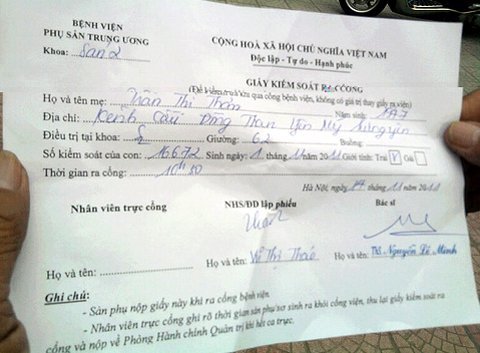 | Để đảm bảo an ninh, mỗi trẻ sơ sinh ra viện phải được cha mẹ xuất trình giấy ra cổng do bệnh viện cấp, trên đó có chữ ký bác sỹ điều trị |