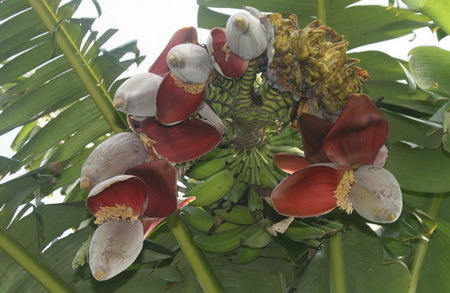 | Buồng chuối có 7 hoa xếp theo hình rẽ quạt. Một trong số đó đã nở hoa có dáng như hoa sen |