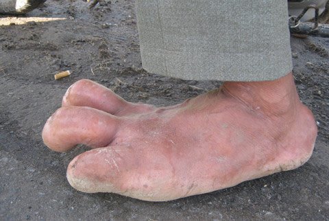Ngón cái của bàn chân và ngón kề ngón cái bình thường, riêng 3 ngón còn lại phình to khổng lồ bằng cổ tay người lớn.