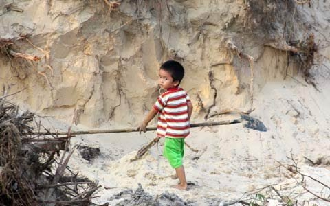 | Hình ảnh cháu bé chưa đầy 4 tuổi theo chân bố mẹ đi làm thuê, xúc cát “trộm” để kiếm sống ở xóm 1 Thạch Đỉnh. Họ chẳng dám động đến số tiền đền bù, vì sợ chẳng đủ làm nhà. Rồi còn công việc nữa. Họ đang lo cho tương lai của nhiều thế hệ cư dân vùng mỏ. Ảnh: Duy Tuấn |