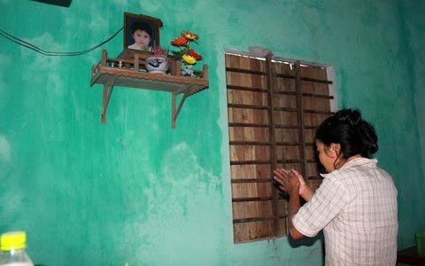 | Chị Lan trước bàn thờ đứa con ngoan, học giỏi đã vĩnh viễn nằm lại ở moong mỏ. Ảnh: Duy Tuấn |