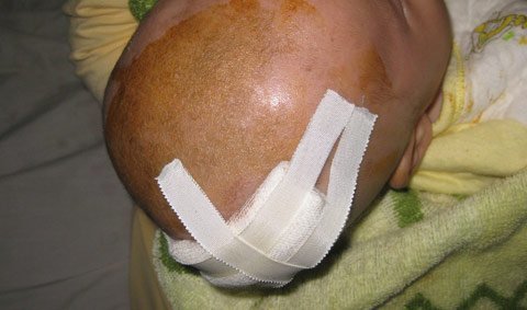 | Đầu cháu Tài sau khi được phẫu thuật đang băng bó băng trên đỉnh đầu. |