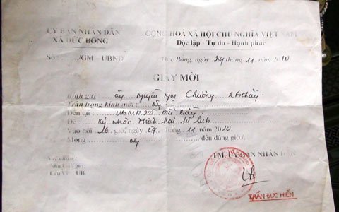 Anh Chương kể: vào ngày 29/11/2010, UBND xã Đức Bồng có giấy mời gia đình chúng tôi “ký nhận thiệt hại do lũ” và có công văn gửi về Ban mặt trận xóm 2, Bồng Thắng có ghi rõ 3 hộ dân được nhận hỗ trợ 30 triệu đồng gồm: Lê Đức Trinh, Nguyễn Ngọc Chương và Lê Thị Tính.