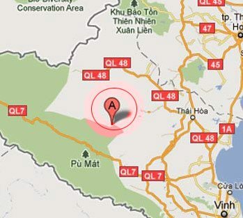 | Địa điểm xảy ra tai nạn thảm khốc (vòng tròn đỏ) cách TP Vinh 200 km - Ảnh: maps.google. |