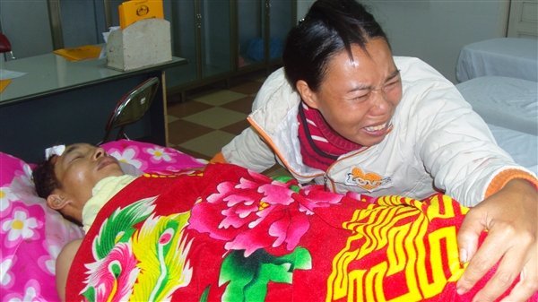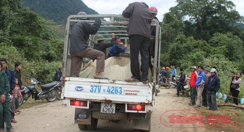 | Chị Vy Thị Thích (vợ anh Thích) bật khóc bên chồng. Chị Thích cho biết, chồng chị đi bốc gỗ thuê đêm 06-12 chỉ đế kiếm 100.000 đồng mua gạo.. ( Ảnh: Tiền Phong) |