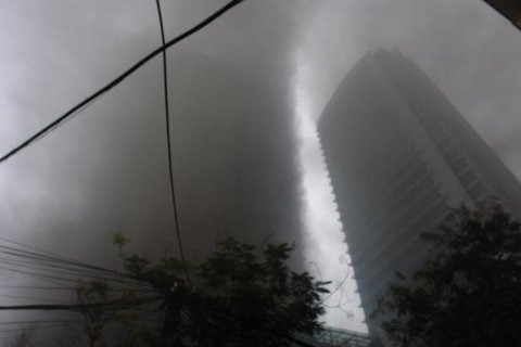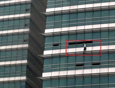 | Một công nhân hoảng sợ, không đủ kiên nhẫn và bình tĩnh để chờ đợi đã liều mình bật kính thoát ra ngoài từ tầng 25. 2 tháp cao trên dưới 30 tầng của tòa nhà này đều bọc kín bằng kính nên khói khó thoát ra, nếu đứng bên trong lâu bị khói hun thì có khả năng bị ngạt (Ảnh: Dân Trí) |