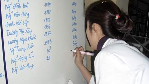 | Cán bộ bệnh viện viết tên các nạn nhân vụ cháy đang điều trị tại viện để người nhà nạn nhân yên tâm. |