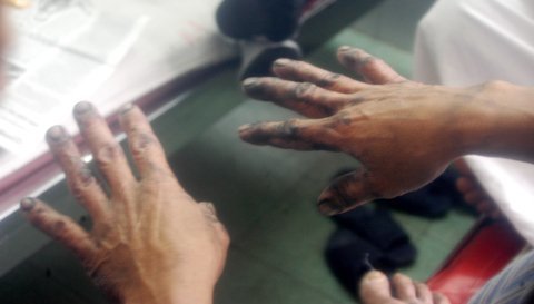 | Bàn tay bám đầy khói đen của bác Lung sau khi được cứu thoát. Có lau rửa bằng chất gì thì lớp khói đen này vẫn không hết |
