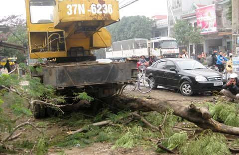 húc đổ một cây phượng bên hành lang đi bộ, trục đường QL1A, đi qua TP. Vinh. Cây