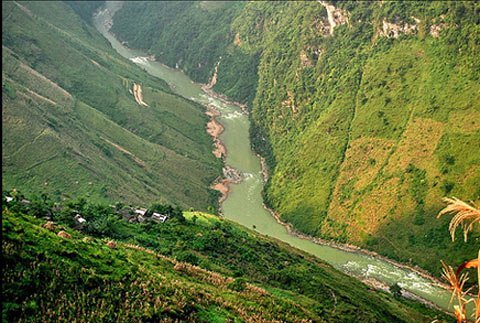 | Dòng sông Nho Quế chảy dưới chân đèo Mã Pí Lèng như một dải lụa màu xanh. Ảnh: Muathusau |