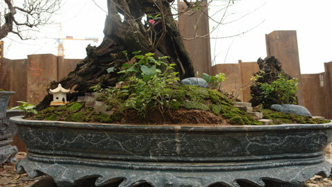 | Cây đào cổ được đặt trang trọng trên một chiếc chậu đá. |