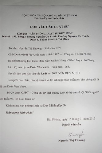 | Đơn mời luật sư của chị Nguyễn Thị Thương |