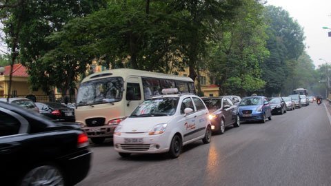 | Ô tô xếp thành hàng dài trên đường Hoàng Hoa Thám |