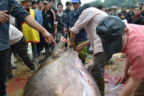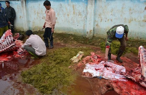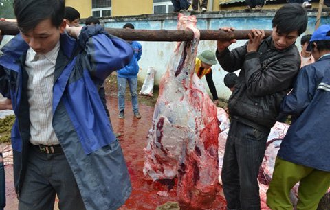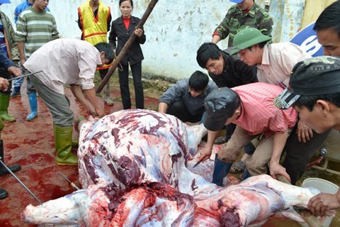 | Trâu chọi sau khi bị điện giật, bị chọc tiết rồi cắt chân, rạch bụng |